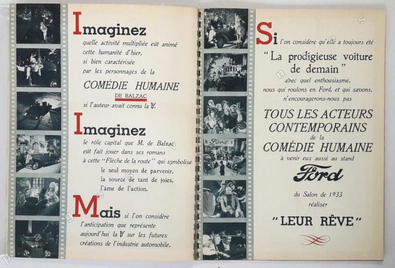 Album du centenaire présentant un film anachronique dans lequel le dernier modèle V8 anime tout un groupe de personnages symboliques du siècle dernier, acteurs de la Comédie Humaine de Balzac.Illustré par la photographie.