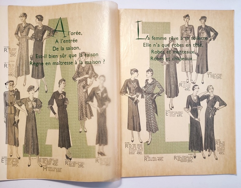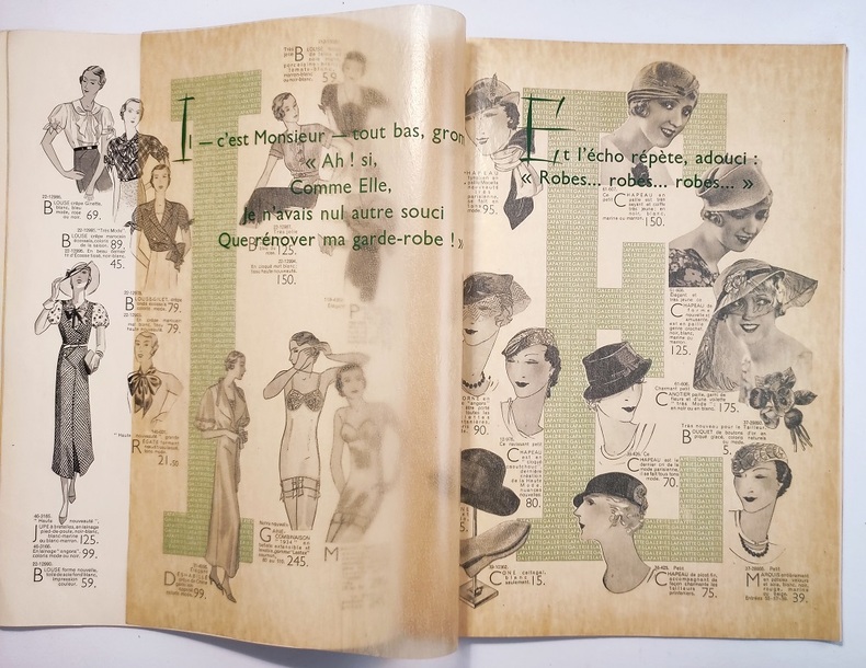 Editée par Les Galeries Lafayette avec la collaboration de Maximilien Vox et Libis. Les huit feuillets illustrés de modèles de mode à prix marqués sont intercalés de papier calque imprimé.