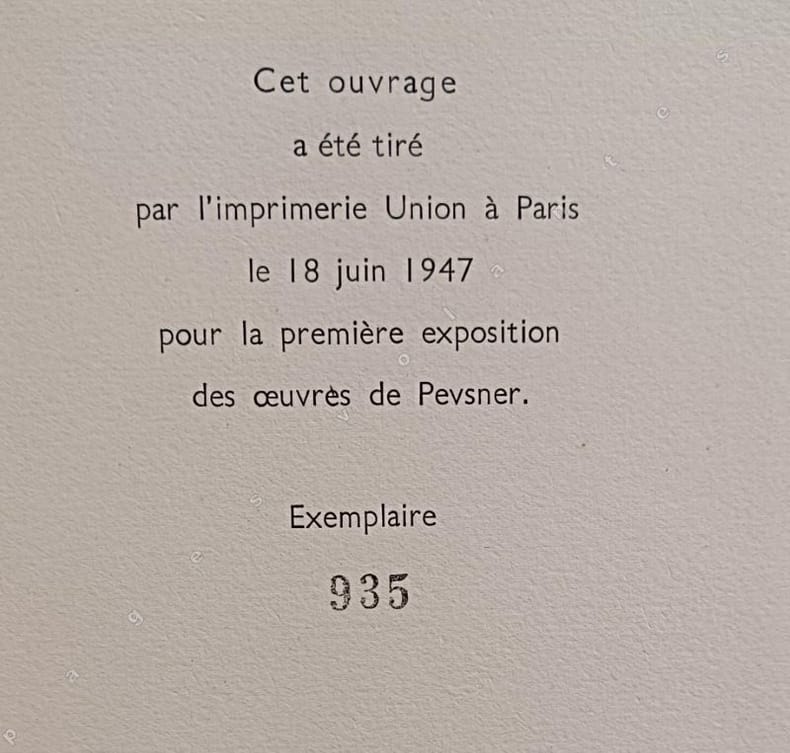 Catalogue de la première exposition de Pevsner. Exemplaire justifié (n° 175). * Voir photographie(s) / See picture(s). * Membre du SLAM et de la LILA / ILAB Member. La librairie est ouverte sur rendez-vous.