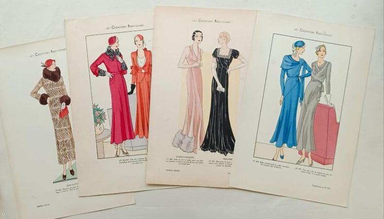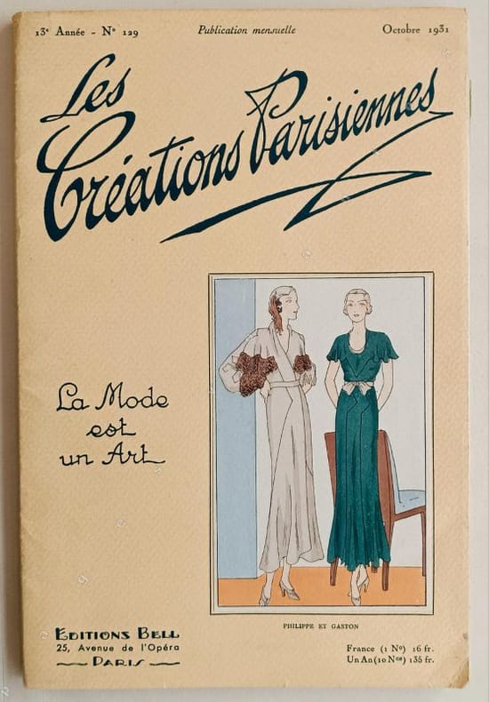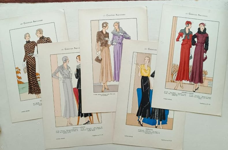 Recueil de 7 planches de 14 modèles contrecollés en couleurs et de 15 planches au pochoir sur carton fort avec description des 27 modèles ( manque une planche).Bien complet du fascicule de 16 pages décrivant les modèles avec un texte de Renée Bonheur ( 2 petits découpis). Modèles de Philippe et Gaston, Jenny, Jean Patou, Tollmann, Martial & Armand, Dupouy Magnin, Mirande, Simone Gray, Bernard, Madeleine ...