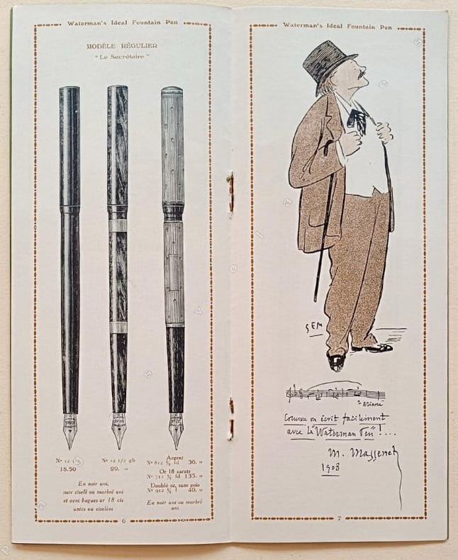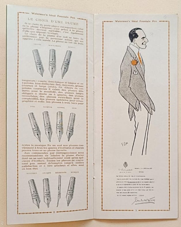 Catalogue publicitaire illustré de modèles de stylos et de 3 planches dessinées par Sem.