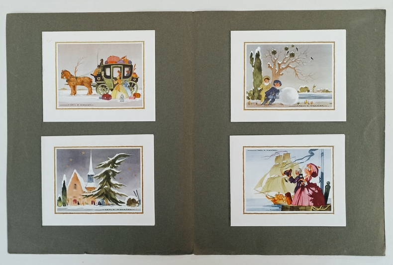 Marcus éditeur, 4 cartes de voeux dépliantes, ( 31 X 12 cm), sous chemise éditeur.