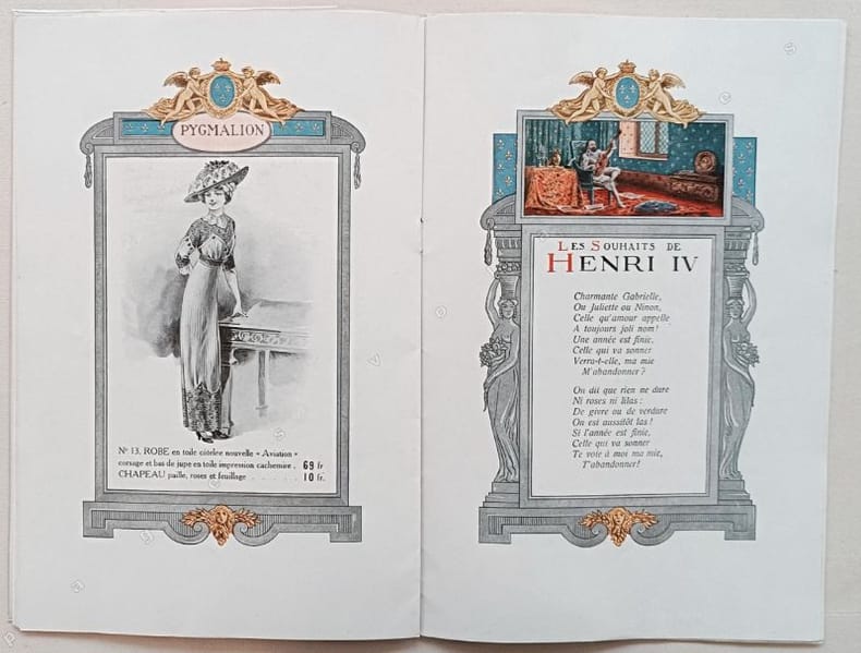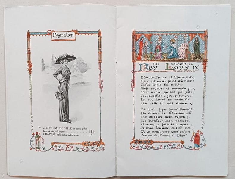 Plaquette publicitaire illustré de compositions en couleurs de P. Heuzé faisant face à 10 modèles de mode encadrés dans des portiques en couleurs.