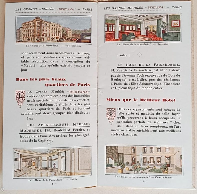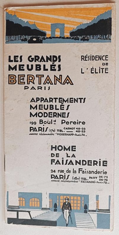 Catalogue détaillé avec illustrations en couleurs et plans des Meublés Bertana installés et décorés par les Studios d'Art "Maga", 63 Bd Magenta à Paris.