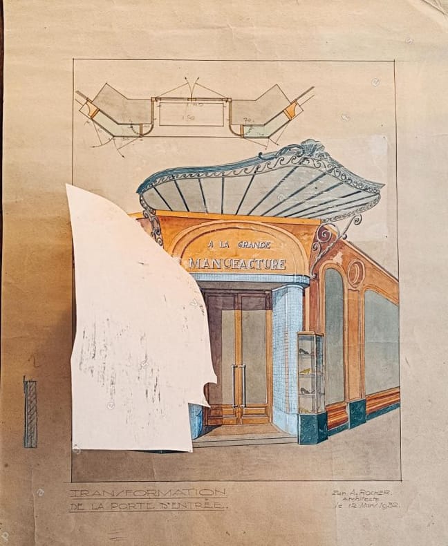 Deux projets originaux de devanture de magasin de chaussures présentés sur la même maquette en soulevant le premier projet pour découvrir le second.