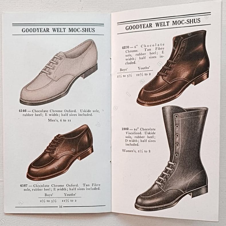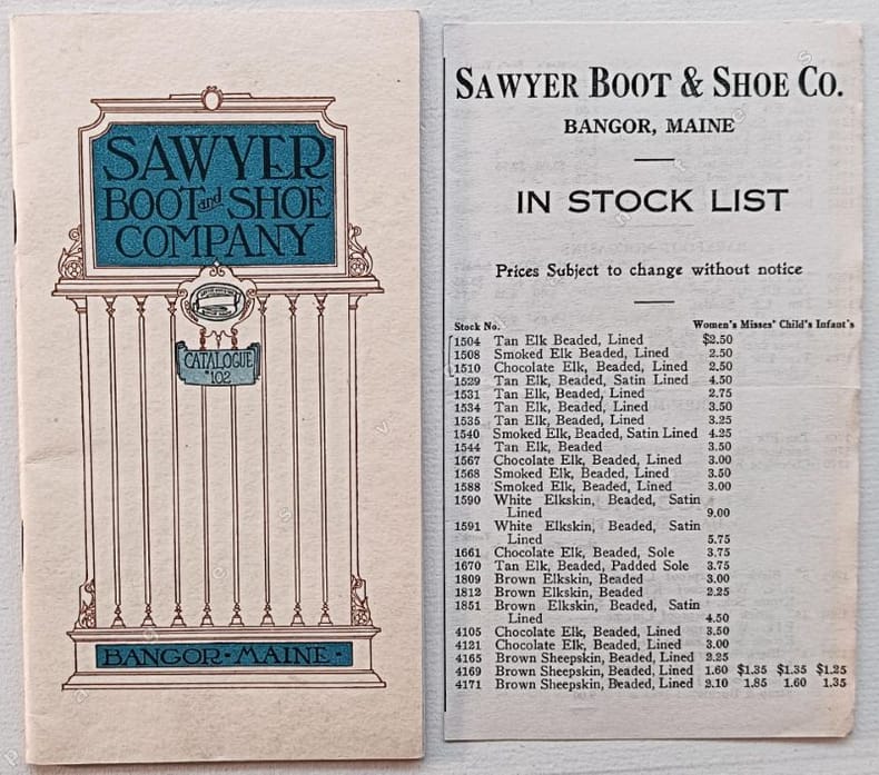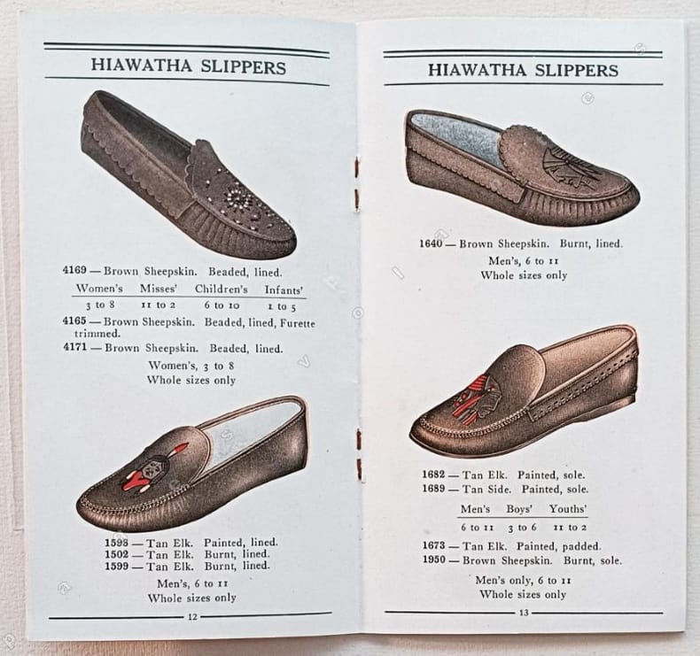 Bien complet du double feuillet des tarifs."Moc Shu", " Hiawatha" slippers, "Bareffot" Moccasins, etc...