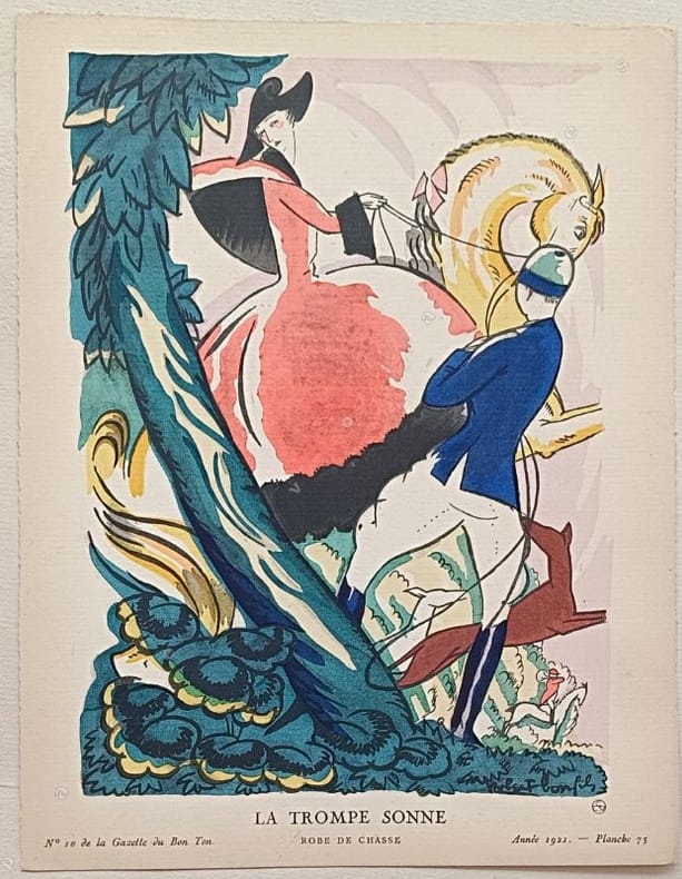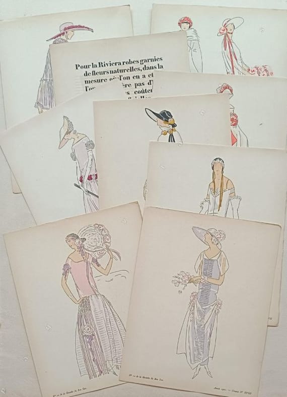 8 planches hors-texte dont 2 par Marty, les autres de Robert Bonfils, Siméon, Georges Lepape, Pierre Mourgue, Pierre Brissaud, George Barbier.Illustrations dans le texte de Charles Martin, Chastel, Baratin.Et 8 planches dans une chemise « Pour la Riviera, Robes garnies de fleurs ».