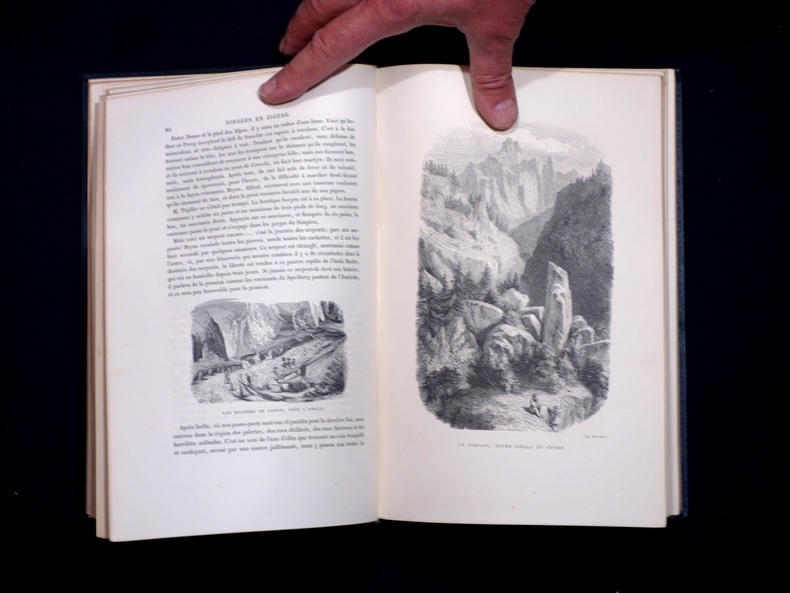 Grand in-8 ( 27,5 X 19,5 cm) de 460 pages. Demi reliure chagrin vert foncé et plats de percaline de même couleur. Dos avec 4 nerfs et 4 caissons ornés. Titre et tranches dorés. Illustrations en noir d’après les dessins de TOPFFER et 15 grands dessins de CALAME. Quatrième édition. Bel exemplaire, quasiment sans rousseurs.