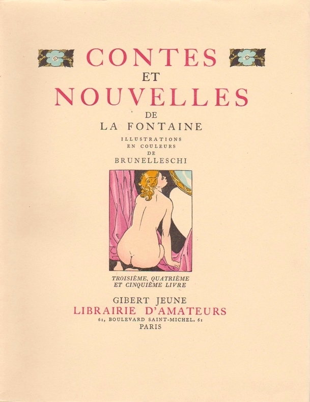 Inutile de revenir sur le texte des Contes et Nouvelles en vers de La Fontaine, paru pour la première fois entre 1665 et 1671 (sans illustrations) et pour la première fois illustré en 1685. Aquarelle originale monogrammée Aquarelle originale signée (définitive) ayant servi au clichage De nombreux artistes ont illustré ces Contes et Nouvelles en vers, toujours lestes ou grivois, avec ou sans l'inspiration délibérément érotique que chacun a pu y mettre depuis la première édition illustrée de 1685. Aquarelle originale monogrammée Les Contes et Nouvelles en vers de La Fontaine, inspirés de plusieurs œuvres françaises et italiennes des XVe et XVIe siècles, dont le Décaméron de Giovanni Boccace, Orlando furioso de Ludovico Ariosto, le recueil anonyme des Cent Nouvelles Nouvelles et l'œuvre de Bonaventure Des Périers, sont mille fois plus réjouissant à lire que les célèbres Fables dont on a rebattu les oreilles de tout élève en devenir d'être un homme. Les Contes et Nouvelles avaient sans l'ombre d'un doute mille fois plus de raisons pour forger un homme près à affronter son destin croisant celui des dames. Chacun cherche son chat ... Aquarelle originale monogrammée Cette édition est à tort négligée des bibliophiles du fait d'un tirage trop important. Il faut rechercher comme ici les exemplaires de luxe. Aquarelle originale monogrammée Les aquarelles originales de Charles Martin sont très prisées des amateurs. Il fut un des grands illustrateurs de la période Art Déco. Charles Martin est né à Montpellier en 1884 et mort à Paris en 1934 à l'âge de 50 ans seulement. Sa production est très importante. Il a contribué à l'illustration de nombreuses revues d'art et de mode depuis 1912 (Gazette du Bon Ton, Femina, etc). La guerre où il sert comme simple soldat d'infanterie stoppe nette sa carrière mais il continue malgré tout à dessiner et à envoyer ses travaux à la presse, tant qu'il peut. Lors d’une permission, il montre son travail à Lucien Vogel, le créateur de la révolutionnaire Gazette du Bon Ton. Enthousiaste, l’éditeur lui propose d’en tirer un album. Sous les Pots de Fleurs (le terme désigne le casque Adrian qui équipe l’armée française) paraît le 1er décembre 1917. Comme un Laboureur ou un Chas Laborde, Martin refuse de se soumettre à la « culture de guerre ». On ne trouve chez lui aucune des outrances et conventions du dessin naturaliste et de son pseudo réalisme. Il revient de la guerre. Le style de Charles Martin, au trait délicat, excelle dans les techniques de l'eau-forte et du pochoir rehaussé d'un trait typographique. Influencé par le cubisme, son style devient épuré et se caractérise par un trait précis, efficace et joyeux. Il s'oriente rapidement vers le luxe et l'art décoratif. Il exerce son talent dans les domaines les plus variés : mode, flacons de parfumerie, meubles, papiers peints, affiches, etc. Charles Martin a illustré une vingtaine de livres dont les Contes et Nouvelles de La Fontaine que nous présentons ici. Nous soupçonnons par ailleurs Charles Martin d'avoir illustré un clandestin totalement érotique en 1926 dont le trait est vraiment typique de l'artiste (mais ...). Aquarelle originale monogrammée Exceptionnel exemplaire contenant 8 aquarelles originales abouties et 1 esquisse pour une composition libre, une suite libre de 15 eaux-fortes en noir et une suite complète des 64 compositions hors-texte (soit 143 estampes au total). Très bon exemplaire tel que paru.
