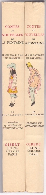 2 volumes in-4°, brochés (20,3 X 26,5 cm), XII +171pp et VI + 234 pp + table, couvertures crèmes ornées d’une vignette, en couleurs, lettrage des titres en rouge et noir, illustrations du grand Brunelleschi (77 dessins en noir et blanc et 32 planches hors-texte en couleurs), tirage limité à 3000 exemplaires (ici le N° 2921), papier velin des Papeteries de Navarre.Les deux tomes sont dans un état parfait.