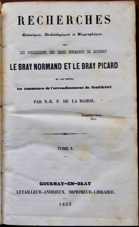 Gournay-en-Bray, Letailleur-Andrieux, imprimeur-libraire, 1852. 2 vol. in-8, rel. de l'époque, demi-chagrin noir, dos à nerfs, ornés d'un filet doré, titre et tomaison bordés d'un filet doré, millésimé en queue des dos, plats granités, gardes peignées, tranches mouchetées, 2ff. n.ch., 353pp, errata; 2ff. n.ch., 188pp.