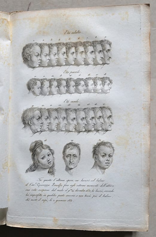 Milano, Stamperia Reale, 1830. In-8, demi-percaline verte à coins de l’époque, plats de papier brun, dos titré, [1]f.-XXXII-436 pp.-[1]f., titre gravé par Prada et 2 planches h.-t. dont la dernière planche de profils humains gravée par Longhi et son portrait en médaillon dessiné et gravé par Anderloni. Index en français des graveurs étudiés, manuscrit, ajouté à la dernière garde. Edition originale.
