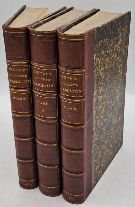Nouvelle édition plus complète des oeuvres de Hamilton. Oeuvres diverses : Lettres et épitres. Tome I : Le bélier. poésies. Tome II : Fleur d'épine ; chansons. Tome III : Les quatre facardins ; poésies. Chaque conte possède sa propre page de titre. Reliure en plein veau blond marbré d'époque. Dos à nerfs orné. Pièce de titre et de tomaison en maroquin rouge. Coiffes de tête légèrement élimées. Frottements. 2 coins émoussés. Bon exemplaire. Outre qu'il soit l'auteur des fameux Mémoires du Comte de Grammont, Hamilton a écrit plusieurs contes qui furent fort goutés en leur temps et qu'on insère habituellement dans le florilège des contes du XVIIIe. - Photographies et détails sur www.Edition-Originale.com -