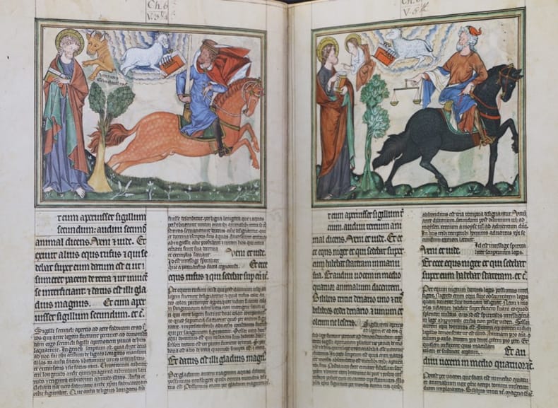 Akademische Druck- u. Verlagsanstalt / Paris, Club du Livre, 1981. In-4, (22,5x32 cm), reliure éditeur pein-cuir marron à riche décor doré, accompagné d'un volume de commentaires demi-cuir marron, 124 pp., les 2 volumes sous étui bordé. Tirage limité à 5000 exemplaires numérotés. Belle réimpression en fac-similé de L'Apocalypse dite de Douce, un manuscrit de l'Apocalypse de Jean enluminé datant du troisième quart du XIIIe siècle ; il contient 97 miniatures à mi-page, dont certaines inachevées, à l'état d'ébauche. Le style des miniatures est directement inspiré de celui en cours à l'époque de Saint Louis à Paris.