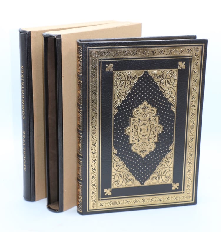 PARIS XVII. CLUB DU LIVRE. 1981. FORT IN-8 (33 X 23 X 7,5 CENTIMETRES ENVIRON) DE (31) + 100 FEUILLETS MANUSCRITS ET ILLUSTRES REPRODUITS EN FAC-SIMILE EN COULEURS ET EN DORE, RELIURE DE L'EDITEUR PLEIN VEAU NOIR ENTIEREMENT ORNE D’UN DECOR DORE, DOS A CINQ FAUX-NERFS, SOUS ETUI BORDE. ACCOMPAGNE D'UN VOLUME DE TRADUCTION ET D'ETUDE, DE 124 + (6) PAGES, RELIURE 1/2 BASANE NOIRE, TITRE DORE SUR DOS LISSE, SOUS ETUI. ENSEMBLE DE 2 VOLUMES. BON EXEMPLAIRE.