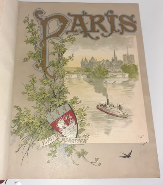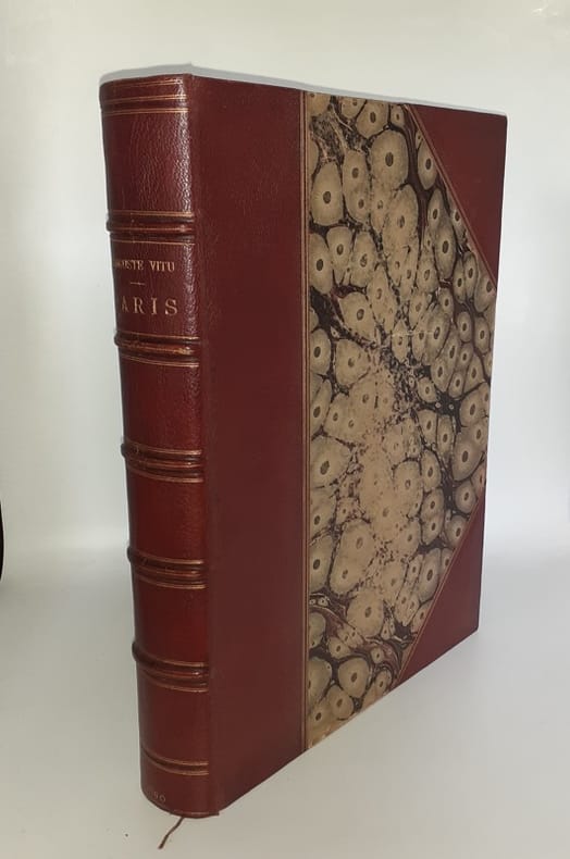 Maison Quantin 1889 In-4. Cartonnage de l’éditeur pleine percaline rouge, 1er plat polychrome représentant une péniche sur la Seine avec en toile de fond l'Île Saint Louis, titre or encadré d'une bordure bleu azur, blason de la ville de Paris rouge et bleu entrelacé dans un motif fleuri signé G. FRAIPONT gravé par AILLOT, dos lisse, titre imprimé rouge, Tour Eiffel couleur or imprimée, vignette de l'éditeur gravée en couleurs sur le deuxième plat, plats biseautés, dos lisse orné d’une tour Eiffel dorée, auteur, titre et éditeur dorés, tête dorée, 450 dessins et gravures hors-texte et dans le texte, 512 pp. Reliure en l’état, intérieur assez frais. Assez bon exemplaire.
