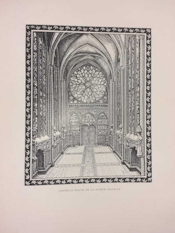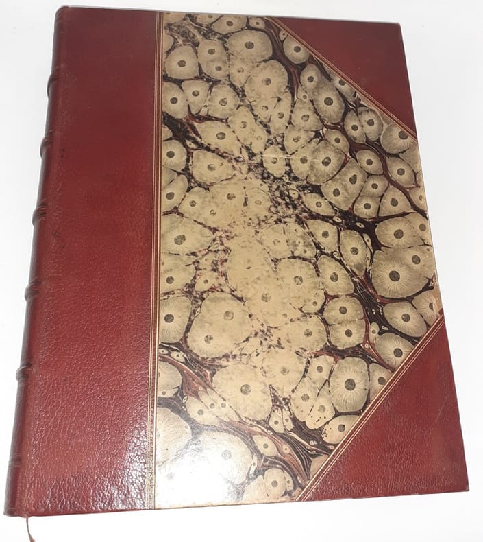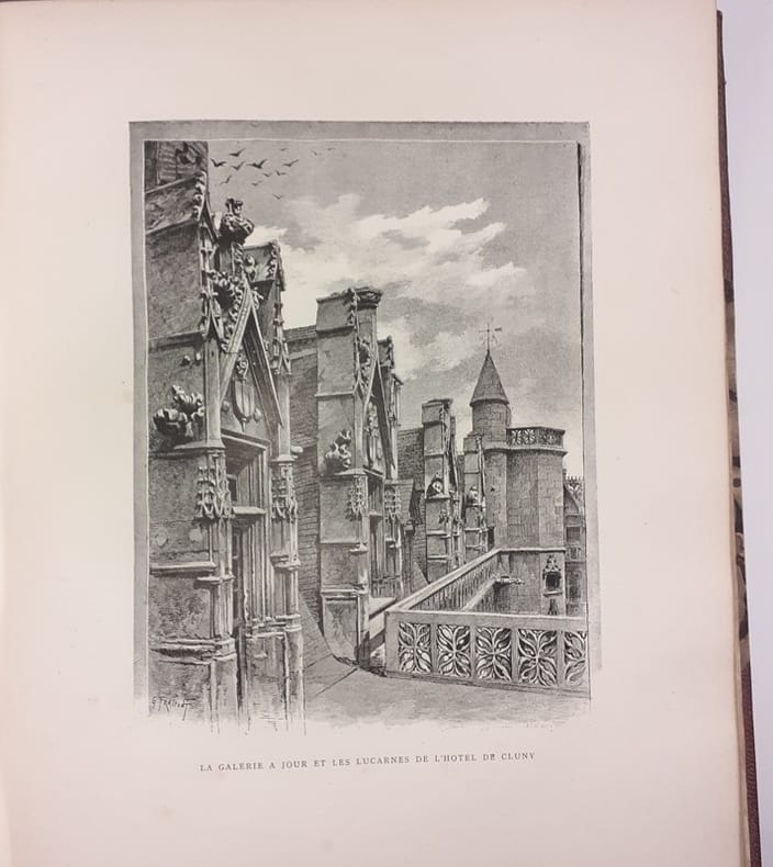 Paris Quantin 1889 -in-folio un fort volume, reliure demi-chagrin bordeaux in-folio à coins (binding half shagreen in-folio with corners) (28,5 x 37,5 cm), RELIURE D'EPOQUE, dos à nerfs (spine with raised bands), décoration or et à froid (gilt and blind-stamping decoration), titre et auteur frappés "or" (gilt title) avec un filet or, filets à froid (matt lines) de part et d'autre des nerfs, plats décorés à froid, mors et coins ornés d'un double filet à froid (double blind stamping line), papier peigné bordeaux, gris, vieux rose et crème aux plats (painting paper), Tête lisse dorée (gilt top-edge), gouttière et tranche de queue non-rognées, Édition originale, Page de titre rouge & noir, orné de 450 dessins inédits daprès nature, dont nombreux à pleine page en noir, (512 + 1 p. de table) Pages, sans date (1889) Paris Quantin Editeur,