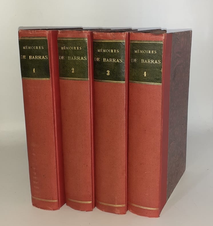 Complet en 4 volumes : tome I : Ancien Régime - Révolution ; tome II : Le Directoire jusqu'au 18 fructidor ; tome III : Le Directoire du 18 fructidor au 18 brumaire ; tome IV : Consulat, Empire, Restauration. Index analytique. Barras est une des personnalités de premier plan et des plus controversées de la Révolution et de l'Empire : Conventionnel régicide, proche de Bonaparte à partir du siège de Toulon, nommé général commandant les armées de Paris pour réprimer Robespierre et son parti, puis, plus tard, l'insurrection royaliste du 13 vendémiaire an IV à l'aide de Bonaparte, il est élu Directeur le 31 octobre 1795. Jugé trop dangereux par Napoléon, il est écarté de la vie politique sous le Consulat et l'Empire. La publication de ses mémoires est très controversée. Il faut lire à ce sujet la longue notice de Jean Tulard (n° 82 de sa bibliographie) ainsi que l'article de Biré dans les Mémoires et Souvenirs (III, 83-102). Edition originale de ces importants et intéressants mémoires qui correspondent aux papiers que Barras avait légués à Rousselin de Saint-Albin et que ce dernier avait renoncé à publier. (Fierro, 78. Tulard, 82)