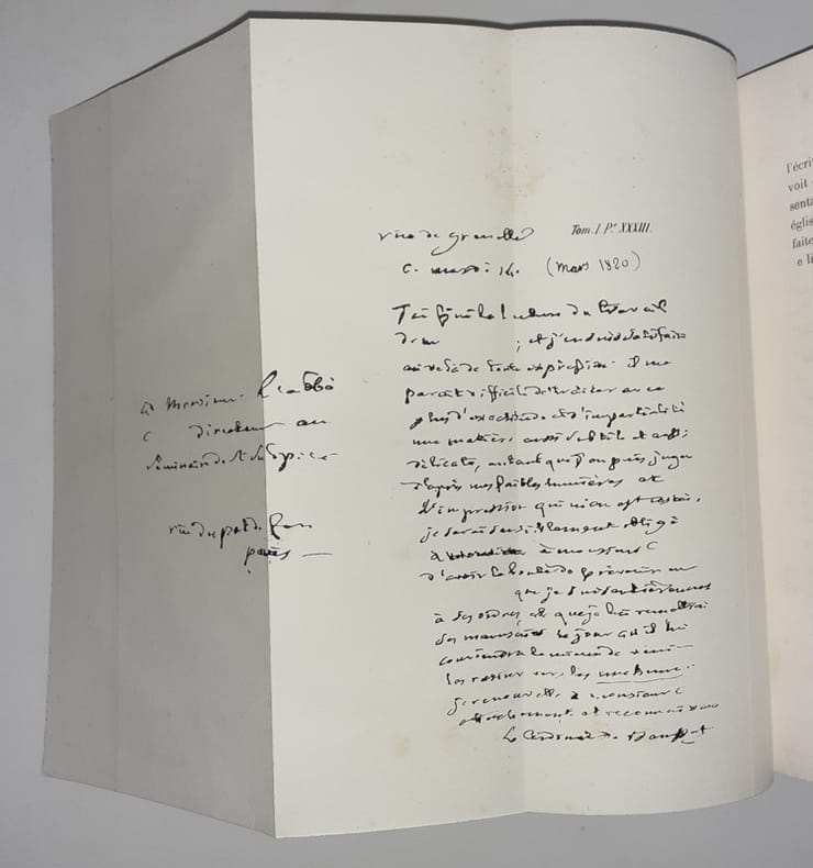 envoi sans frais J. Leflon, Monsieur Emery, II, L'Eglise concordataire et impériale, Paris, 1947 ; Albert Cherel, Fénelon au XVIIIe siècle, son prestige, son influence."Né le 24 décembre 1748 à Pondichéry, où son père, le marquis de Bausset, exerce des fonctions civiles, il fait ses études classiques au collège des Jésuites de La Flèche, ses études théologiques au grand séminaire S.-Sulpice et reçoit le sacerdoce en 1773. M. de Boisgelin, archevêque d'Aix, le prend bientôt comme vicaire général, et en 1784 le roi le nomme évêque d'Alais. Député du Languedoc aux Assemblées des notables de 1787 et 1788, il présente au roi les doléances de sa province. [...] Son opposition à la constitution civile, son adhésion au l'Exposé des principes lui attirent des persécutions qui l'obligent à se réfugier en Suisse [...]. Dès 1792, M. de Bausset revient en France. Arrêté sous la Terreur, incarcéré à Port-Libre, il échappe à la guillotine grâce à Thermidor qui le libère. L'évêque d'Alais se retire alors à Villemoison, près de Longjumeau, et noue avec M. Emery une amitié profonde qu'atteste sa correspondance conservée au séminaire de S.-Sulpice [...]. M. Emery, soucieux du prestige intellectuel du clergé, l'engage à écrire une Vie de Fénelon, lui communique des manuscrits qu'il a pu racheter, contrôle son travail, corrige son texte ; il souhaite que cet ouvrage lui ouvre les portes de l'Institut, voire de l'Académie, devenus des foyers d'athéisme et d'incrédulité. L'Histoire de Fénelon, publiée en 1808, connut un vil succès." (J. Leflon).L'ouvrage valut à son auteur un prix décennal de l'Institut et lui ouvrit les portes de l'Académie française.Cet ouvrage est important car il marque une étape dans la connaissance de Fénelon et de ses oeuvres : "Telle est la grande nouveauté de l'Histoire de Fénelon : ce livre est dans une large mesure une publication d'inédits." (A. Cherel).Cette 3e édition est précieuse : "Le succès de l'Histoire de Fénelon persistait [...]. Bausset en préparait cependant une troisième édition, "revue, corrigée et augmentée", qui parut en 1817. Les augmentations, c'étaient, par exemple, des lettres de Mme de Maintenon à Mme de La Maisonfort, une lettre de Brisacier, une lettre de l'abbé de Rancé à Bossuet, etc. [...] Ainsi l'Histoire de Fénelon a maintenu, par son succès et par la polémique qu'elle a suscitée, le prestige de l'archevêque de Cambrai : elle a fait mieux connaître sa physionomie, grâce aux documents que Bausset a utilisés ou cités...