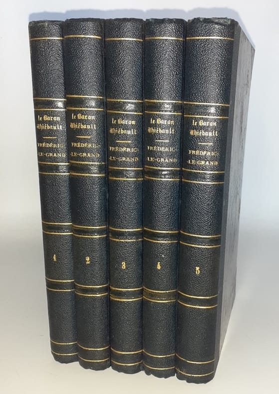 Seconde édition (la plus complète) revue et corrigée, signature manuscrite à la plume à l'encre brune par l'auteur et l'éditeur en début du Tome I........Comprend : 1. Frédéric le Grand ; 2. Frédéric et sa famille ; 3. Frédéric, sa cour, les voyageurs, et les ministres étrangers ; 4. Frédéric et son gouvernement civil et militaire ; 5. Frédéric, son Académie, ses écoles, et ses amis littérateurs et philosophes.....Sujet : Frédéric II (1712-1786 ; roi de Prusse) - Biographie.......Dieudonné Thiébault (1733 - 1807) est un homme de lettres français. Il reçoit l'enseignement des jésuites, puis étudie le droit et les lettres. En 1765, sur la recommandation de D'Alembert et de d'Olivet, il obtient la chaire de grammaire générale à l'École militaire de Berlin. Accueilli par Frédéric II, il gagne la confiance du roi et devient le lecteur de tout ce que ce prince envoie à l'Académie, le correcteur d'un grand nombre de ses ouvrages et l'éditeur de presque tout ce qu'il fait imprimer. Pendant vingt ans, Thiébault vit dans l'intimité de ce souverain qui lui a donné une pension et une place à l'Académie.........Beaux Exemplaires..........TRES RARE.......en bon état (good condition). bon état
