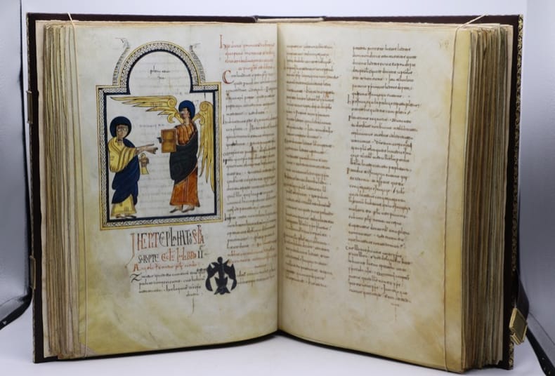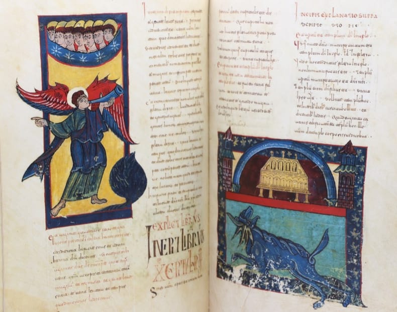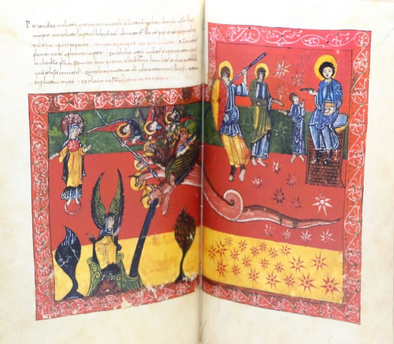 Ce manuscrit enluminé est l’un des joyaux de la tradition des Beatus, commentaires illustrés de l’Apocalypse de saint Jean rédigés par Beatus de Liébana au VIIIe siècle. Il est orné d'environ 70 miniatures aux couleurs vives. Sa particularité est d'avoir été réalisé en deux phases : la première, réalisée à la fin du Xe siècle dans la province de León, contient la majeure partie du texte et la plupart des miniatures, de style mozarabe. La seconde partie provient du monastère de San Millán de la Cogolla, dans la Rioja, d'où il tire son nom, probablement à la fin du XIe siècle. Une nouvelle miniature a été ajoutée et les miniatures préexistantes ont été rehaussées de couleurs ; cette seconde phase témoigne d'influences romanes. Excellent état. - Frais de port : -France 12,8 € -U.E. 15 € -Monde (z B : 36 €) (z C : 76 €)