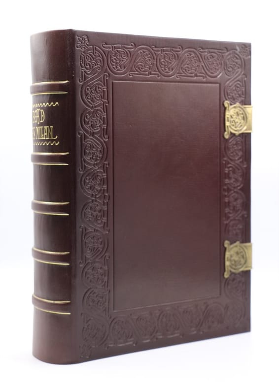 Madrid, Testimonio, 2002. Reproduction intégrale du manuscrit original (Cod. Emil. 33), respectant le format original (environ 25x37 cm), les couleurs et les détails des enluminures, sous une belle reliure plein-cuir marron estampée à froid, fermoirs en laiton, titre et filet doré au dos, roulette dorée sur les coupes. Tirage limité à 980 exemplaires numérotés à la main (n°461).