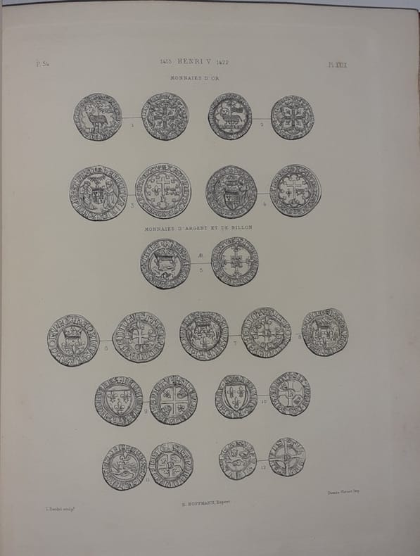 Description des pièces avec indication de leur valeur actuelle, ouvrage orné de 118 planches, 1 vol. in-4 reliure de l'époque demi-maroquin à coins rouge, dos à 5 nerfs, tête dorée, non rogné, reliure signée de R. Petit, Chez H. Hoffmann, Paris, 1878, 1 f. blanc, xv-218 pp., CXVIII planches, 1 f. blanc