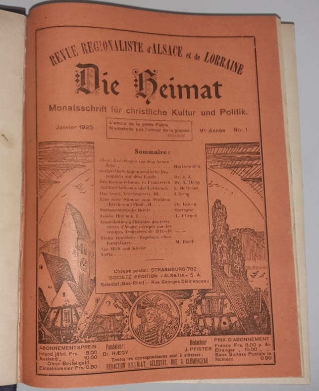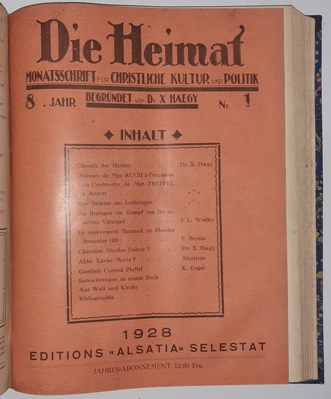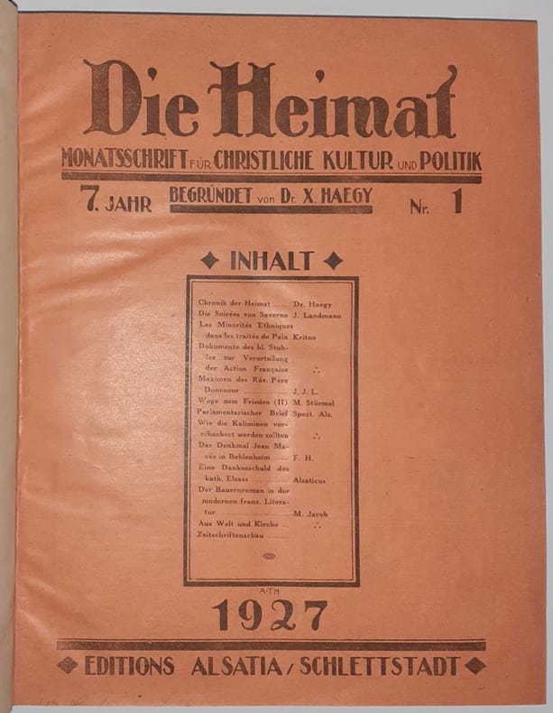 Schlettstadt, Editions Alsatia, 1925-1928. 2 fort vol. in-4, rel. moderne demi-toile enduite bleue, dos lisse, étiquette de titre papier, titre manuscrit, couv. ill. cons.; 376 et 384 pp., 376 et 384 pp., 2 années complètes pour chaque volume, texte en allemand ou en français sur 2 colonnes, bibliographie. Rare.