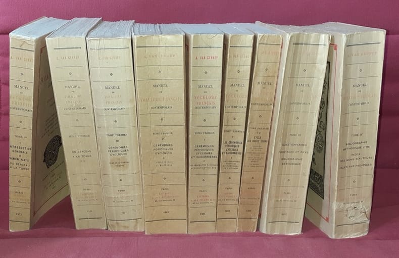 T. I. : I - Introduction et première partie du Berceau à la tombe (Naissance - baptême - enfance - adolescence - fiançailles) - II - Du berceau à la tombe (fin), (mariages - funérailles) - III - Cérémonies périodiques cycliques (Carnaval, Carême, Pâque) - IV - Cérémonies périodiques cycliques (Cycle de Mai, La St Jean) - V - Cérémonies périodiques cycliques et saisonnières (Les cérémonies agricoles et pastorales de l'été) - VI - Cérémonies périodiques cycliques et saisonnières (Les cérémonies agricoles et pastorales de l'automne) - VII - Cycle des douze jours (tournées et chansons de quête, personnification du cycle feux, bûchers et brandons mobiles, la bûche et le tison de Noël). T. III : Questionnaires, provinces et pays, bibliographie méthodique. T. IV : Bibliographie méthodique (fin), index des noms d'auteurs, index par provinces. Couv. un peu jaunies, choc en queue du T. IV, très bon ex. au demeurant. - Frais de port : -France 12,8 € -U.E. 15 € -Monde (z B : 36 €) (z C : 76 €)