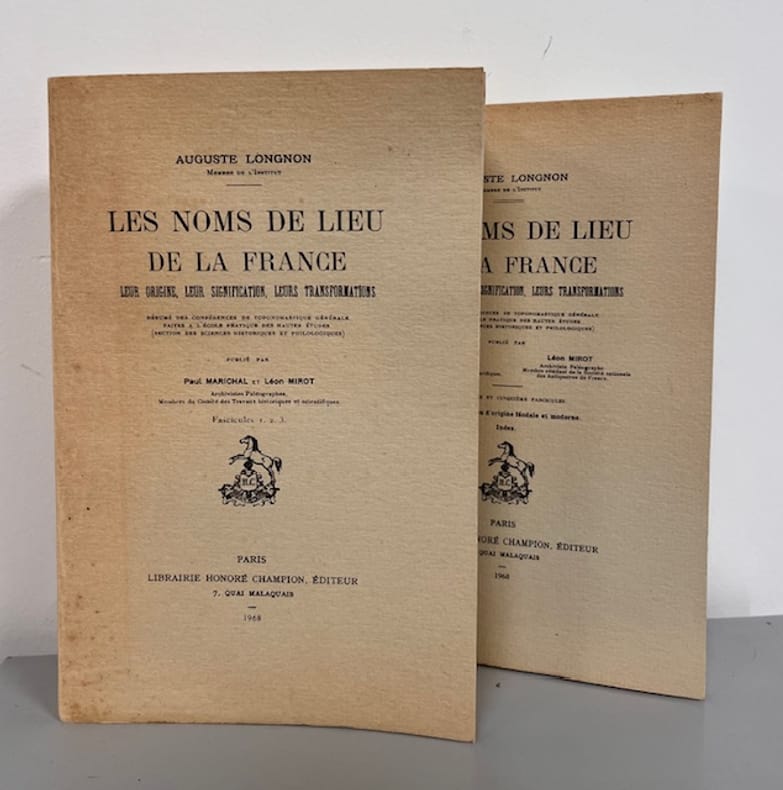 Résumé des conférences de toponomastique générale faites à l'E.P.H.E. Publié par Paul Marichal et Léon Mirot. Fasc. 1 : Noms de lieu d'origine phénicienne, grecque, ligure, gauloise et romaine - Fasc. 2 : Noms de lieu d'origine saxonne, burgonde, wisigothique, franque, scandinave, bretonne et basque - Fasc. 3 : Noms de lieu d'origine ecclésiastique - Fasc. 4 et 5 : Noms de lieu d'origine féodale et moderne. Couverture lég. brunies, bel exemplaire, non coupé. - Frais de port : -France 6,9 € -U.E. 11 € -Monde (z B : 18 €) (z C : 31 €)
