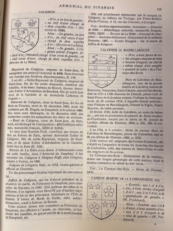 Réimpr. de l'éd. de Privas, (1908), tirée à 250 exemplaires numérotés à la main (n°46). Ouvrage capital pour l'histoire des familles du Vivarais. Notice détaillée pour chaque famille : filiation, carrières, etc., accompagnée des armoiries. Sources. Table des noms. L'édition originale était fort rare et recherchée. Frottements au 1er plat, bon exemplaire. - Frais de port : -France 8,45 € -U.E. 13 € -Monde (z B : 23 €) (z C : 43 €)