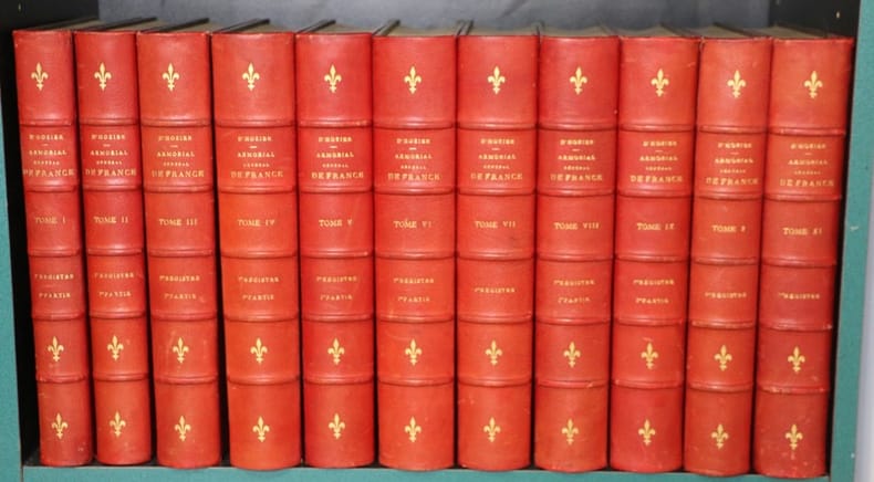 Source fondamentale pour l’étude de l’héraldique et de la généalogie nobiliaire françaises. Nombreux blasons reproduits dans le texte. (Saffroy, III-34205). Bel exemplaire, dans une reliure décorative. Frottements à quelques coiffes et nerfs, une marque sur le plat inférieur des T. V et X, quelques rousseurs pâles, bel état d'ensemble. -