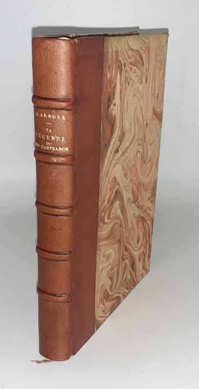 Très curieuse reliure estampée à froid et coloriée au premier plat, orné d'un médaillon central et portant la signature estampée "André" (sur la gauche) et "déposé" (sur la droite). Une véritable curiosité bibliophilique, sans doute un essai de reliure semi-industrielle, peut-être attribuable à Ambroise Saint-André de Lignereux. Né en 1861, mort en 1936, ce décorateur était un spécialiste du travail du cuir et réalisa certaines reliures assez atypiques (voir dans notre catalogue notre exemplaire de "La Légende de Guillaume d'Orange" publié chez Piazza).