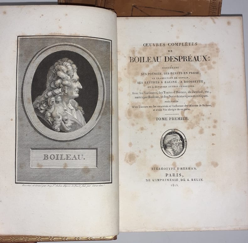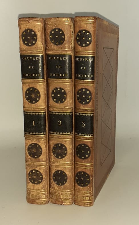 Paris, Stéréotype d'Herhan, de l'Imprimerie de A. Belin, 1813. 3 tomes en 3 vol., in-8, rel. de l'ép. plein veau glacé fauve, dos à nerfs rehaussés et soulignés de filets perlés et filets dorés, 4 décors mosaïqués bruns et dorés entre les nerfs, palette dorée en queue, pièces de titre et de tomaison brunes, titre doré, décors à froid sur les plats composés de dentelles en encadrement, filets géométriques au centre rehaussés de poinçons dorés, dentelles dorées sur les coupes et les chasses, tranches dorées, gardes en papier caillouté ; CXI-368, 492, 379 pp., portrait de Boileau au frontispice dessiné et gravé par Aug. de St. Aubin d'après le buste fait par Girardon, 6 gravures h.-t. par Delvaux, Simonet et De Ghendt d'après Moreau, notes et tables.