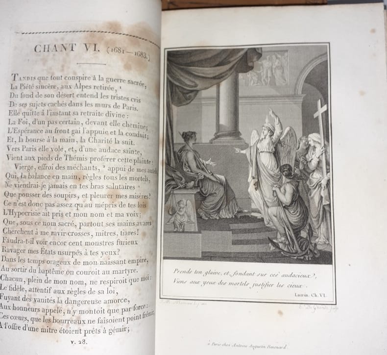 1835 reliure demi-chagrin vert grand in-octavo à coins (binding half shagreen and corners), dos 4 nerfs (spine with raised bands) décoré or (gilt) et titre frappé or (gilt title), mors (joints) et coins à double filet - papier marbré aux plats (cover with marbled paper), tranches jaspées (marbled edges), marque-page en tissu vert (bookmark in tissue), texte 2 colonnes (text - 2 coloumns), illustration : 1 portrait en frontispice (frontispiece portrait), rares et légères rousseurs (rares and lights redness marks), 727 pages, 1835 à Paris Chez Lfèvre Libraire-Editeur,
