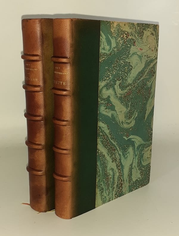 Paris Louis Conard 1908-1910 Ensemble 12 volumes in-8, demi-chagrin rouge, plats de papier marbré, dos sans nerfs ornés en longueur de filets et fleurons dorés; doublures et gardes de papier peigne, têtes dorées, non rognés.Ces volumes extraits des 29 volumes des œuvres complètes de Guy de Maupassant publiées par Conard, regroupent les meilleurs titres de l'écrivain. Bel ensemble dans des reliures décoratives de l'époque.