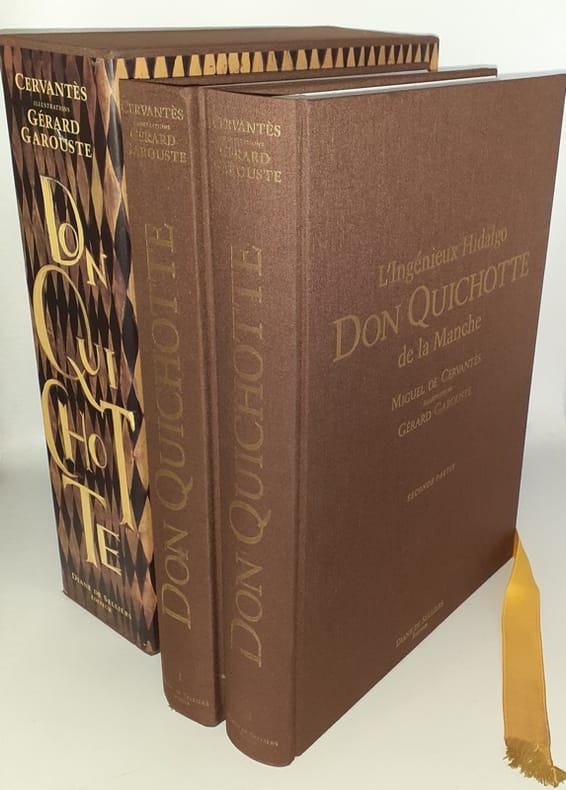 Paris, Diane de Selliers Ed., 1998. 2 forts et grands in-4, rel. éd. pleine-toile chocolat, titre doré au dos et sur le 1er plat, étui rigide demi-toile chocolat, plats illustrés en coul. par Garouste; 318 et 366 pp., illustrés de 150 gouaches et 126 lettrines originales de Garouste spécialement créées pour cette édition, texte sur 2 colonnes. Edition originale de luxe.