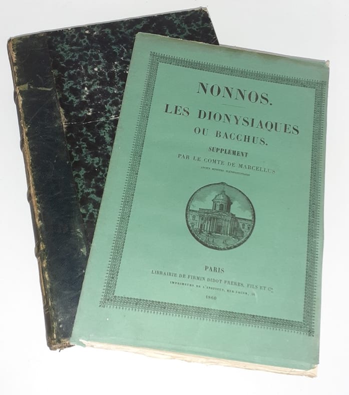 Paris, Firmin Didot frères, 1856. Très fort in-4, rel. de l'ép. demi-basane verte, dos à nerfs, caissons dorés fleuris aux fers dorés, titre doré, tranches mouchetées, (étiquette de classement en queue du dos) ; [2]ff.-LX-[2]ff.-424-291 pp., texte sur 2 colonnes grec et français en regard pour le poème, sur 2 colonnes en français pour les notes et commentaires, tables, index. Nous joignons le supplément, édité à Paris, Firmin Didot, 1860, broché, 16 pp.