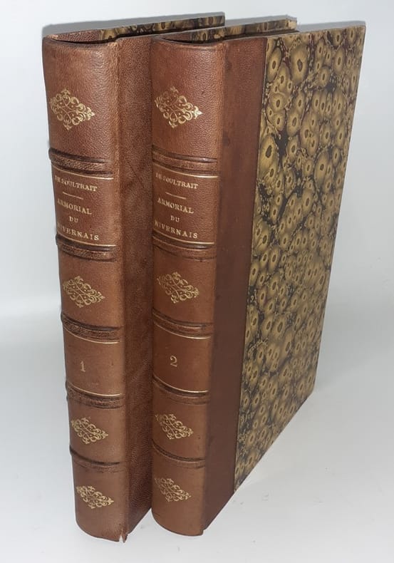 Chez Michot, Librairie De La Société Nivernaise 18 x 27 Nevers 1879 Deux grands volumes in-8, reliure demi-chagrin noir de l'époque, dos à quatre nerfs, titre et tomaison dorés, plats de percaline noire, gardes marbrées, XXXV-282 et 312-[2] pp. 31 planches de blasons gravées sur acier. In fine dictionnaire héraldique, bibliographie, dictionnaire des principaux noms de fiefs. Le comte Georges Richard de Soultrait (1822-1888), né au château familial de Toury-Lurcy, était le fils dun officier de la Garde Impériale. Il a été lun des fondateurs de la Société nivernaise des lettres, sciences et arts en 1851. Edition la plus complète de cet ouvrage de référence pour le Nivernais. Quelques petites marques d'usures à la couverture, légères rousseurs éparses. Bon exemplaire.(VeiB15) PHOTOS NUMERIQUES DISPONIBLES PAR EMAIL SUR SIMPLE DEMANDE-DIGITAL PHOTOGRAPS MAY BE AVAILABLE ON REQUEST
