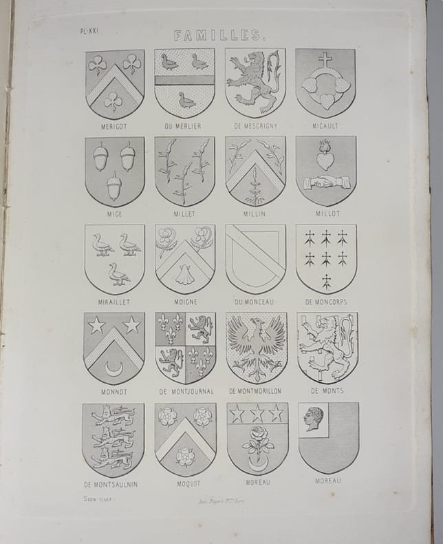 Deuxième édition en partie originale et plus complète que l'édition originale de 1847. Ouvrage illustré de 31 planches hors-texte gravées sur acier représentant les blasons des familles du Nivernais. Image disp.