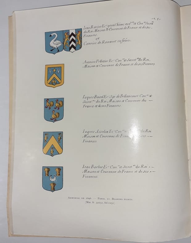 Ce monumental ouvrage donne la description de 18000 blasons de personnes de la bourgeoisie et de la noblesse vivant dans la généralité de Paris au XVII è siècle. Les trois premiers volumes concernent la ville de Paris ; le quatrième les autres villes de la généralité situées dans Yonne , la proche Normandie , le sud de la Picardie ainsi que le nord de l' Orléanais
