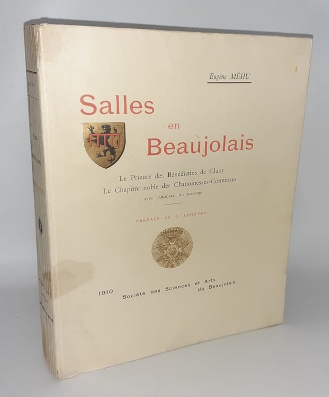 Société des Sciences et Arts du Beaujolais, 1910; gr. in-4 broché, couv. imprimée en rouge et noir, écussons dor. XVI pp., 1 carte en couleurs, 533 pp., 1 f. 35 planches hors-texte. La seconde partie est entièrement consacrée à l’armorial des chanoinesses avec leurs blasons. Tirage à 500 ex. sur alfa, dont les 250 premiers (comme c’est le cas ici) numérotés et signé par l’auteur