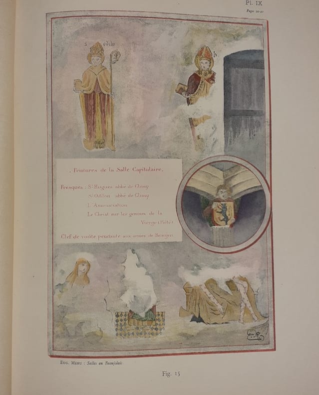 Villefranche, Société des Sciences et Arts du Beaujolais, 1910. Fort in-4, cart. éd. sous jaquette ill. en coul., XVI-533 pp., 124 fig., gravures, plans, blasons, sceaux, reprod. photogr., tableaux généalogiques en n/b., en sépia et en coul. dont 35 h.-t. sous serpentes (1 dépl.), bandeaux, lettrines et culs-de-lampe, ordre géographique des familles, ordre alphabétique des familles, chronologie comparée, liste des noms, inhumations aux caveaux de l'église, étymologies, bibliographie, pièces justificatives, index. Edition originale tirée sur papier d'Alfa en 500 ex. Un des 250 ex. de tête numérotés et nominatifs (N° 122, au Baron de Belleroche, signé par l'auteur.)