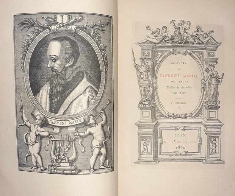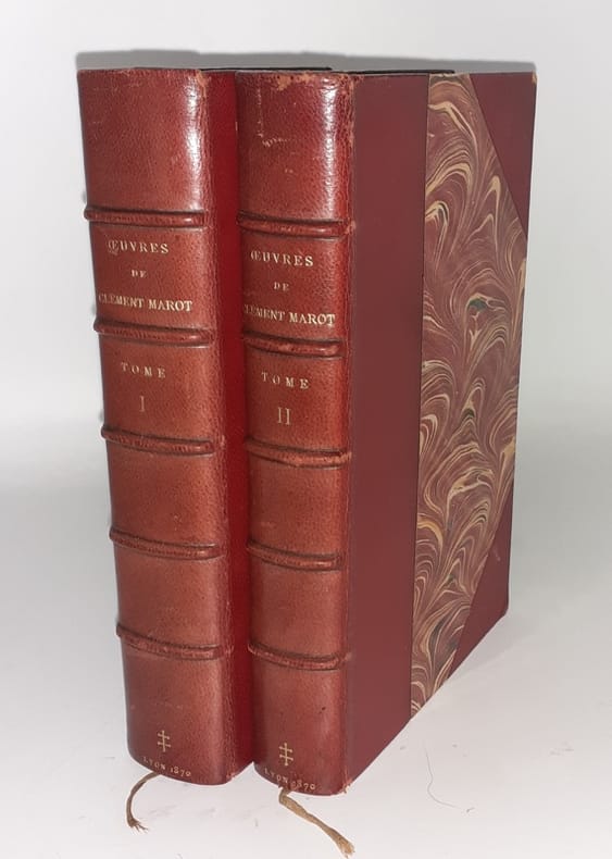 Clément Marot, Oeuvres de Clément Marot de Cahors, Vallet de chambre du Roy. Lyon, N. Scheuring, 1869-1870. 2 volumes in-12, portrait-XVI-[2bl]-VI-551p & [6]-445p. Belle édition sur vergé teinté tirée à 150 exemplaires, n°103, imprimée par Louis Perrin. Bien que la justification n'annonce que ce papier, le tirage fut de 260 exemplaires selon Vicaire : 10 chine, 100 whatman et 150 vélin teinté. Plein maroquin orange, triple filet encadrant les plats, dos à nerfs orné, filets sur les coupes, large dentelle en bordure des contreplats, tranches dorées sur marbrures, étuis. Petits frottements. Quelques petites déchirures. Dos très légèrement passé. La reliure, d'excellente facture, est étonnamment non signée. Bel exemplaire.