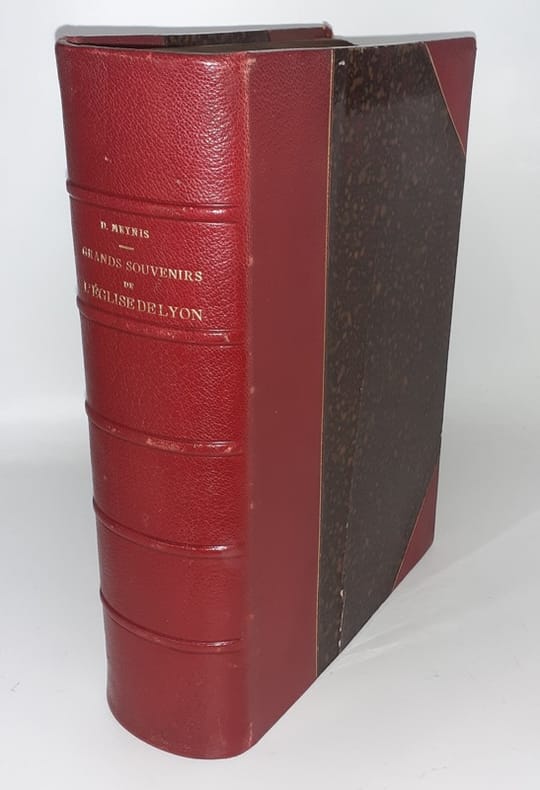 Lyon, Vitte et Perrussel, 1886. Fort in-4, rel. de l'ép. demi-maroquin rouge à coins, dos à nerfs, titre doré, plats bordés d'1 filet doré, tête dorée ; XXXII-550 pp., bandeaux, lettrines et culs-de-lampe, 1 pl. en chromolithographie, 1 pl. en taille-douce, 40 héliogravures h.-t., 38 gravures in-t., liste des Evêques et Archevêques de Lyon, monuments de l'Antiquité chrétienne, tables. Un des exemplaires du tirage de tête sur grand papier (n°II, pour M. Mathevon).