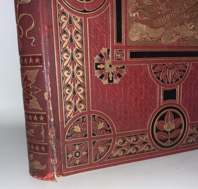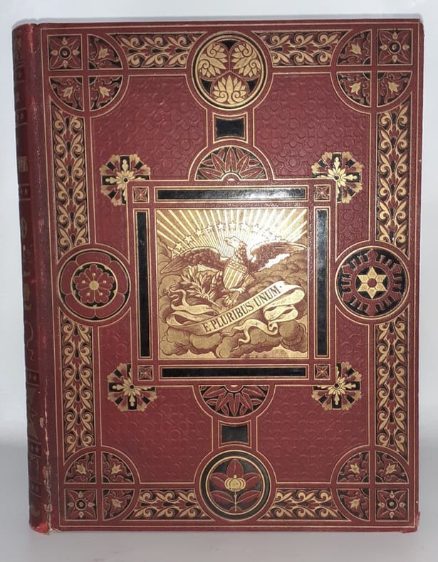 1877 P., Hachette, 1877, 1 vol. grand in-4° (345 x 275 mm) reliure de l'éditeur, dos chagrin rouge orné de motifs géométriques et floraux noir et or, plat supérieur orné d'un décor à motifs géométriques et floraux noir et or, entourant un cartouche central carré aux emblèmes américains et devise "E. Pluribus Unum", plat inférieur encadré de jeux de filets gras et maigres à froid en noir avec en son centre, un "H" ailé, toutes tranches dorées (Cartonnage non signé mais attribué à Souze par Huret), de (2) ff. (faux-titre et titre) - 679 pp.Quelques rousseurs, essentiellement en premières pages, superbe état, cartonnage flamboyant, rare dans cet état.