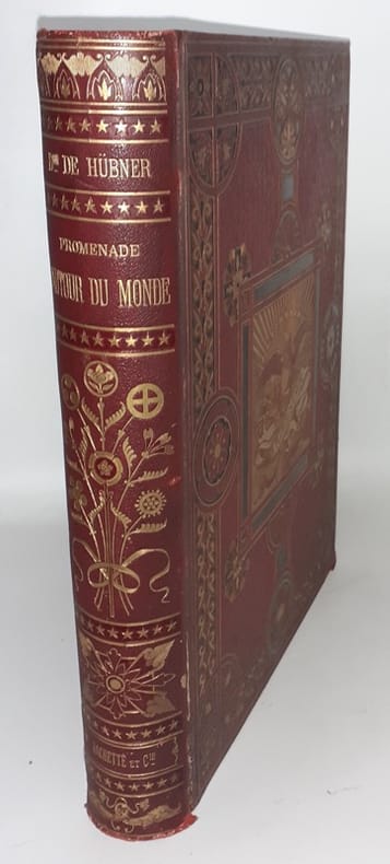 1871 Hachette, Paris 1877 - Un fort et grand volume, in-4, plein chagrin rouge éditeur décor à plaque illustrée par Souze.[4], 679 pages gravées sur bois par Avenet, A. de Bar, E. Bayard, E. Bocourt, E. Boulanger, etc. Portait en frontispice. Joseph Alexandre baron de Hübner, (1811-1892) fut un diplomate autrichien très actif qui en 1871 décida de faire le tour du monde. Il en ramena des notes de voyage ainsi qu'une riche iconographie qui furent publiées pour la première fois en 2 volumes in-8 en 1872. cette présente édition, la cinquième, est la première au format in-4, illustrée d'un portrait frontispice de l'auteur et de 316 gravures sur bois. Bel exemplaire malgré de minimes frottements à la reliure et aux coins et de très rares et pâles rousseurs marginales,poids : 4.2kg,