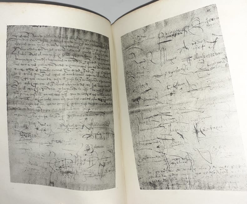 Sevilla, Imprenta de E. Rasco, 1894. In-8, rel. de l'ép. demi-basane fauve, dos à nerfs, pièces de titre de maroquin vert, roulettes à froid en tête et en queue, titre et fleuron dorés, couv. cons. ; CCXXXIX- 278 pp., bandeaux, lettrines et culs-de-lampe, 3 planches de fac-similé, notes, index, texte en espagnol. Annotations et soulignements manuscrites au crayon y compris sur les pp. de garde. Bel ex-libris Elysio de Cavalho. Première édition, tirage limité à 200 ex., le notre porte le n° 129.