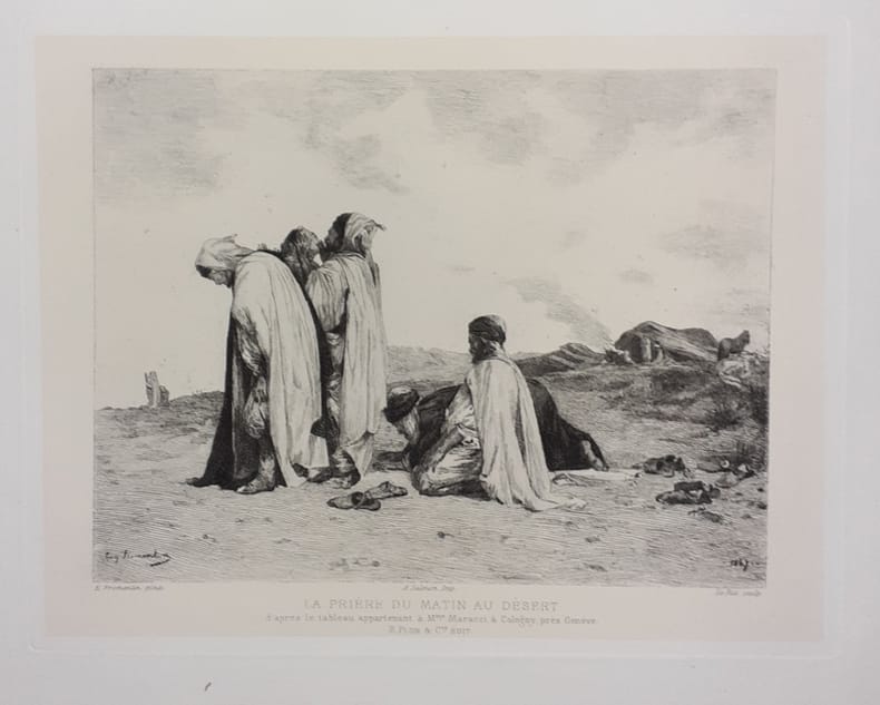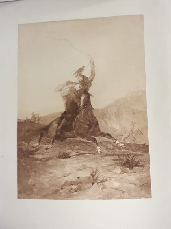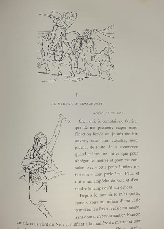 Le frontispice est tiré en deux états (couleurs et sépia) , 12 gravures sont en deux états (noir et Chine) et 12 eaux-fortes en 4 états : avec la lettre sur chine appliqué ; avant la lettre sur chine appliqué ; avant la lettre en bistre sur chine appliqué ; avant la lettre sur chine volant. Après avoir terminé ses études, Eugène Fromentin étudie le paysage sous Louis Cabat et visite l'Algérie en rapportant de nombreuses études. En 1852, il est chargé d'une mission archéologique et retourne en Algérie. Il continue son voyage dans le Sahel et le Sahara en écrivant et en dessinant et publie par la suite d'intéressantes relations sur les pays qu'il a parcouru. L'originalité de ces récits de voyage, c'est que Fromentin y est peintre plus encore qu'écrivain, coloriste avec la plume comme avec le pinceau. Dans ce travail d'interprétations, Fromentin fut servi par une mémoire prodigieuse des sensations, des impressions et des effets. Les deux récits sont d'un peintre par l'acuité de la vision, d'un poète par les vibrations de la sensibilité, tandis que les jugements et les analyses révèlent une critique d'une rare pénétration. R. Dumesnil.