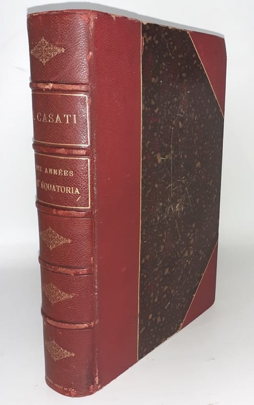 Paris, Librairie de Firmin-Didot et Cie., 1892. in-4° 26,3 cm , xi pp ( frontispice, titre impr. en rouge et noir) + 498 pp + 4 cartes in fine ( une carte relié à l'envers). Reliure d'époque en demi-cuir rouge, filets dorés sur les plats, dos à nerfs orné de filets dorés et fleurons dorés, titre doré. Edition originale de la traduction française, complète de ses 4 cartes, dont 3 dépliantes. L'iconographie est complétée par 170 compositions in et hors-texte. ''Le 24 décembre 1879, Casati s'embarquait à Gênes pour Souakim avant de gagner Karthoum. Bel exemplaire de l'édition originale française.